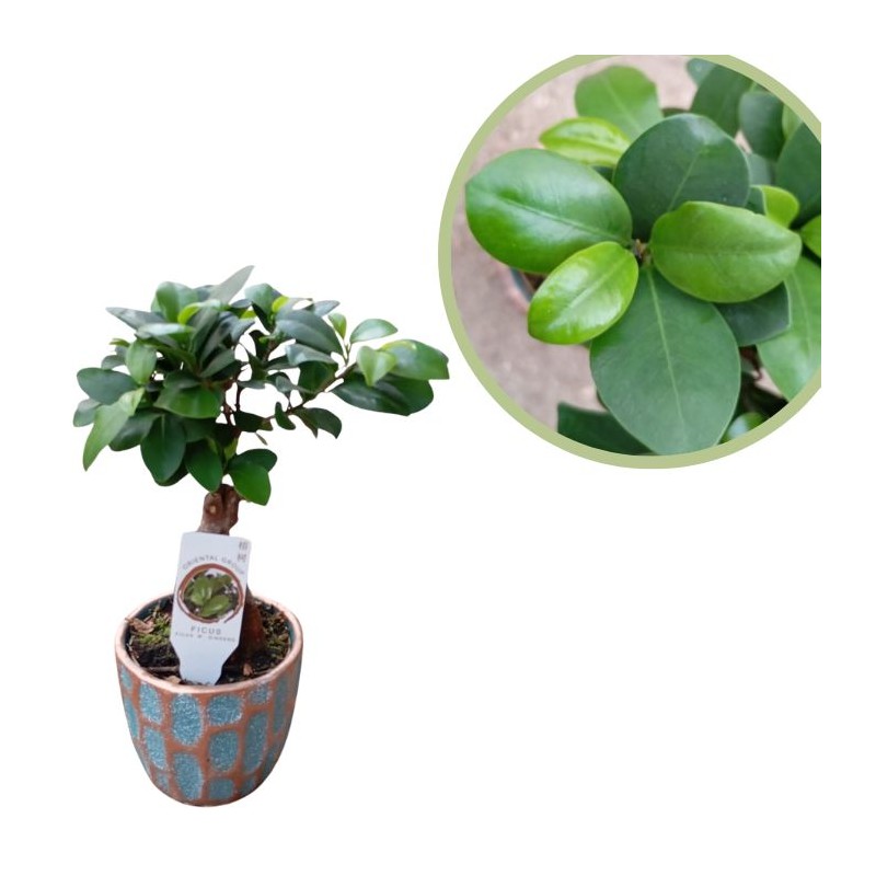 El ficus ginseng cuenta con raíces aéreas, de ahí su apariencia tan bonita. Puede alcanzar un metro de altura, aunque lo habitual es cultivarlo como bonsái. Tiene un crecimiento lento y, como media general, se debe replantar cada año y medio. Es una planta perenne con hojas verdes intensas y brillantes.