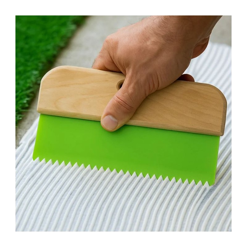La espátula para césped artificial se utiliza principalmente para extender adhesivos, ajustar juntas o alisar el césped durante la instalación. Permite trabajar de manera precisa en zonas difíciles y asegurar que las fibras queden correctamente alineadas. Fabricada con materiales resistentes, ofrece durabilidad y facilidad de manejo, siendo imprescindible para profesionales y aficionados que busquen un acabado perfecto en sus instalaciones de césped sintético.
