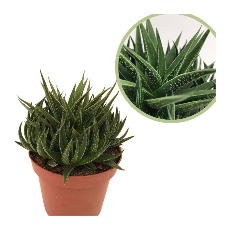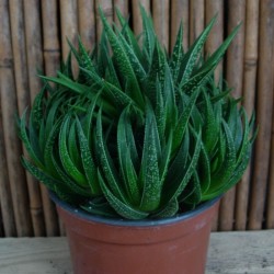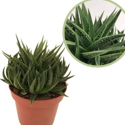 La Haworthia herbacea es una suculenta originaria de Sudáfrica, muy valorada por su roseta de hojas carnosas, triangulares y algo rugosas. Su color varía entre verde claro y verde oliva, con pequeñas manchas blancas que aportan textura y luminosidad. Tiene un crecimiento lento y compacto, lo que la hace ideal para macetas pequeñas. Es fácil de cuidar y perfecta para interior, ya que tolera la semisombra y requiere poco riego. Su floración es discreta, con pequeñas flores blancas en espigas finas.