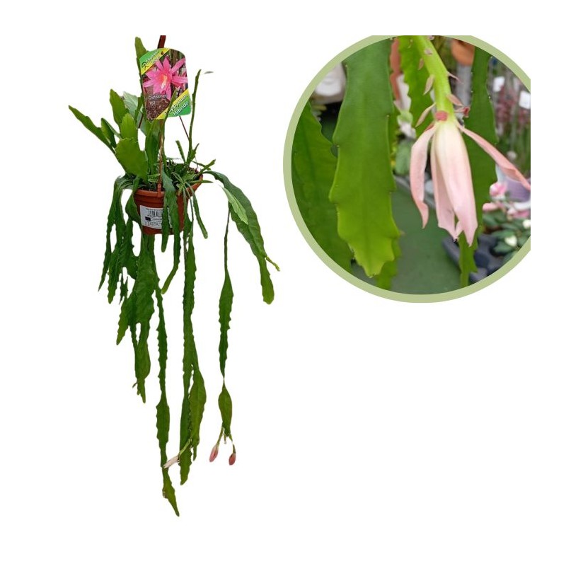 El Epiphyllum híbrido es un cactus epífito que destaca por sus tallos planos y su espectacular floración. Produce flores grandes y vistosas que pueden aparecer en diferentes colores según la variedad, como blanco, rosa, rojo o naranja. Es una planta muy decorativa, ideal para macetas colgantes, estanterías o terrazas protegidas, aportando un toque tropical y elegante. Prefiere ambientes luminosos sin sol directo y requiere cuidados sencillos.