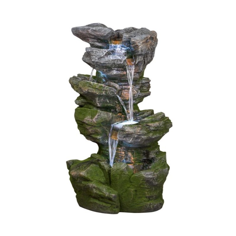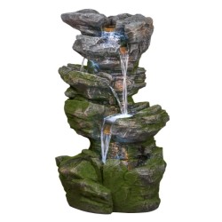 Las formas tradicionales de las fuentes inspiran esta colección que se adapta a los espacios vivos dotándoles de luminosidad y de los sonidos relajantes y armoniosos que proporciona el agua al fluir. La poliresina es una mezcla de varias resinas especialmente resina de poliéster, que al calentarse se transforman en una resina muy flexible y moldeable, que cuando se seca y enfría, se endurece formando así un material muy duradero, ligero y resistente.