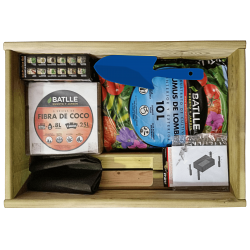 Este Pack incluye un huerto urbano de madera con sus complementos, sustrato Natura de 20 litros y 3 bolsitas de semillas de plantas aromáticas.