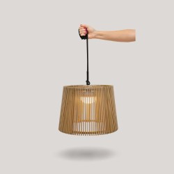 Fabricada en polietileno con efecto ratán, la Okinawa Hang simula el aspecto de una lámpara de mimbre, pero con toda la resistencia del material plástico. Es ligera, portátil y funciona con batería recargable por USB, ofreciendo hasta 20 horas de autonomía. Su luz LED blanco cálido crea ambientes acogedores, y el mando a distancia incluido permite controlarla cómodamente. Gracias a su asa superior, se cuelga fácilmente en pérgolas, ramas o techos.