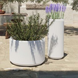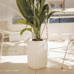 Macetero cilíndrico de diseño elegante, fabricado en polietileno resistente a rayos UV y temperaturas extremas, ideal para uso interior o exterior.