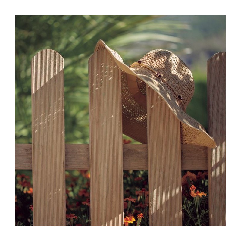 Terminación con lamas redondeadas en la parte superior. Tratada con Autoclave nivel 3. Madera rallada.