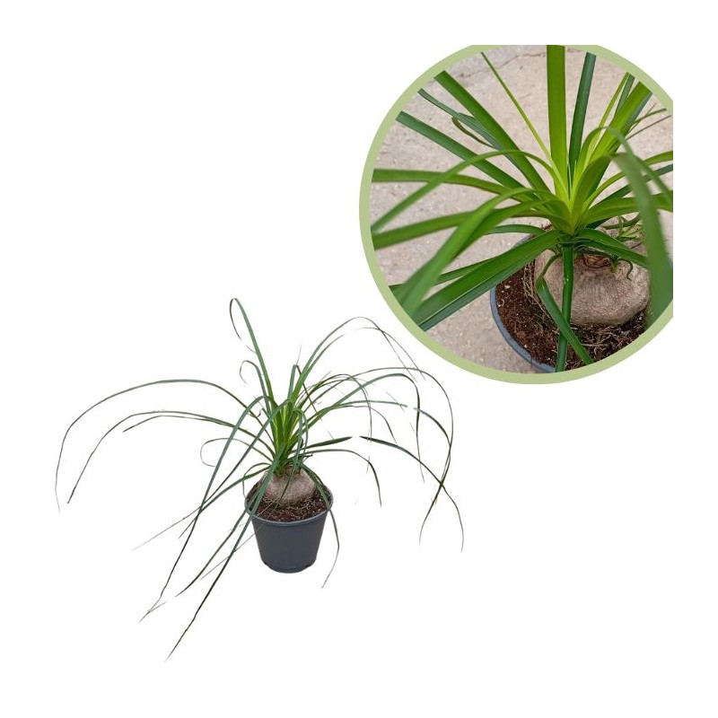 La Nolina, conocida comúnmente como pata de elefante, destaca por su base engrosada que almacena agua y sus largas hojas finas y arqueadas que caen en forma de cascada. Su porte escultórico la convierte en una planta muy decorativa, perfecta para aportar un toque moderno y minimalista en hogares, oficinas o terrazas protegidas. Es una planta de bajo mantenimiento y muy resistente a la sequía.