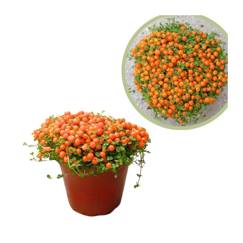 Nertera Astrid, planta ornamental tapizante con pequeñas bayas naranjas muy llamativas, perfecta para dar color a interiores y terrazas. Pequeña planta muy similar al helixine con pequeños frutos color naranja.