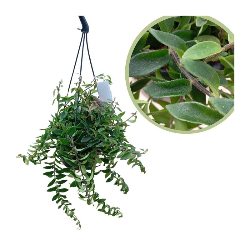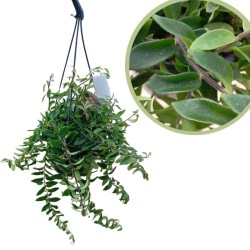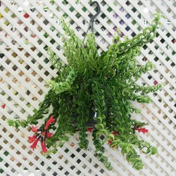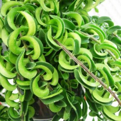 Características: Ramas colgantes con aspecto de tirabuzones caracterizan al Aeschynanthus ‘Twister’. Su parecido a un sacacorchos se debe a la forma recurvada y semicerrada de las hojas y a su disposición a lo largo de los tallos.