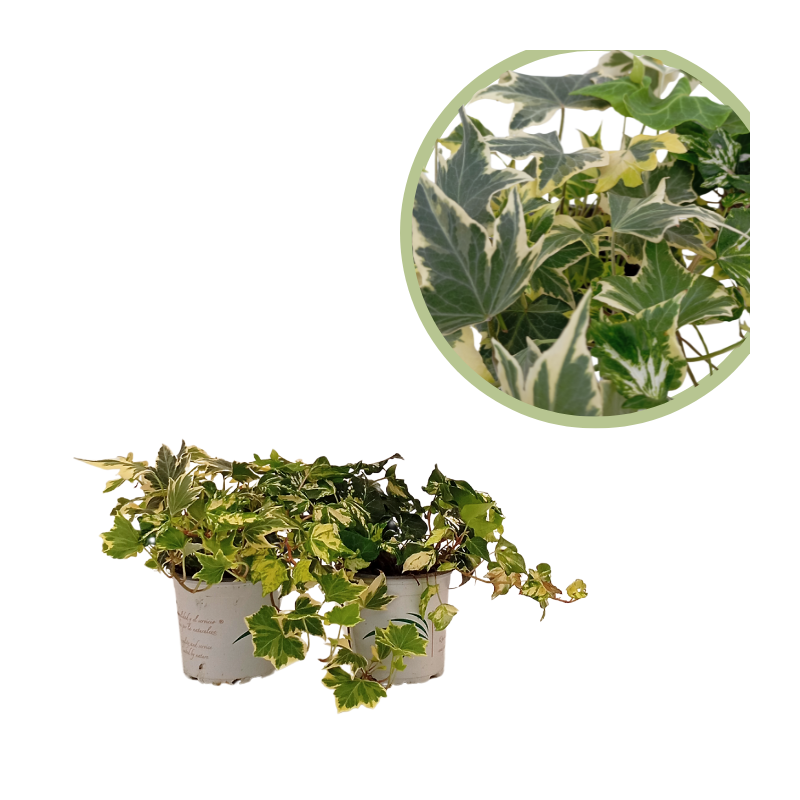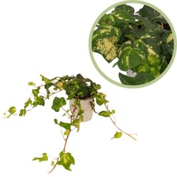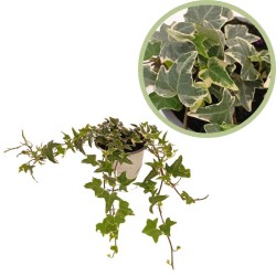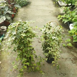 Hiedra con maceta y colgador, ideales para lugares con sol e interiores. También se puede utilizar como trepadora, se coge a las paredes.