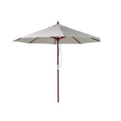 Parasoles de madera de Teka de color oscuro. Parasol de tejido de poliester anti-UV.